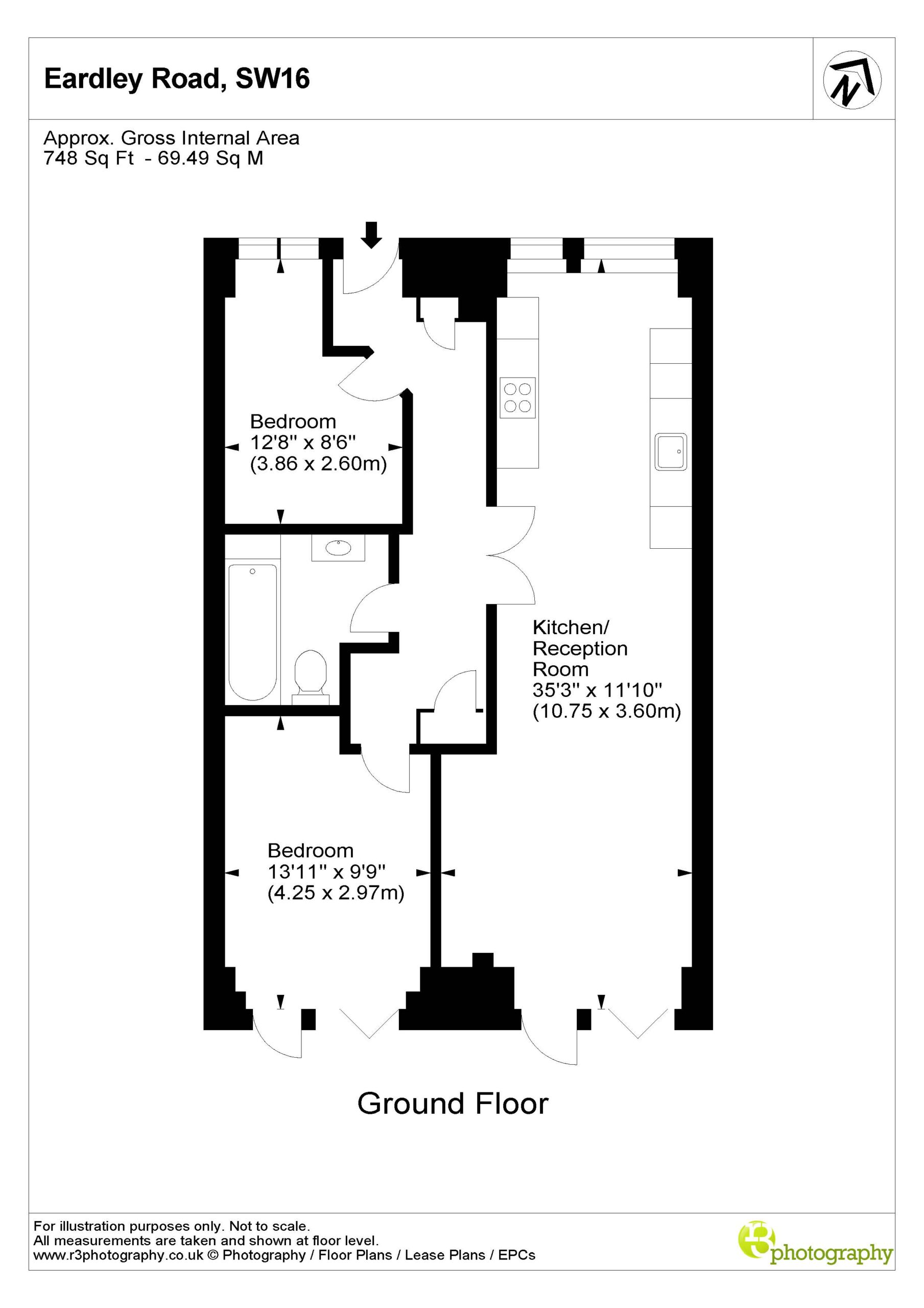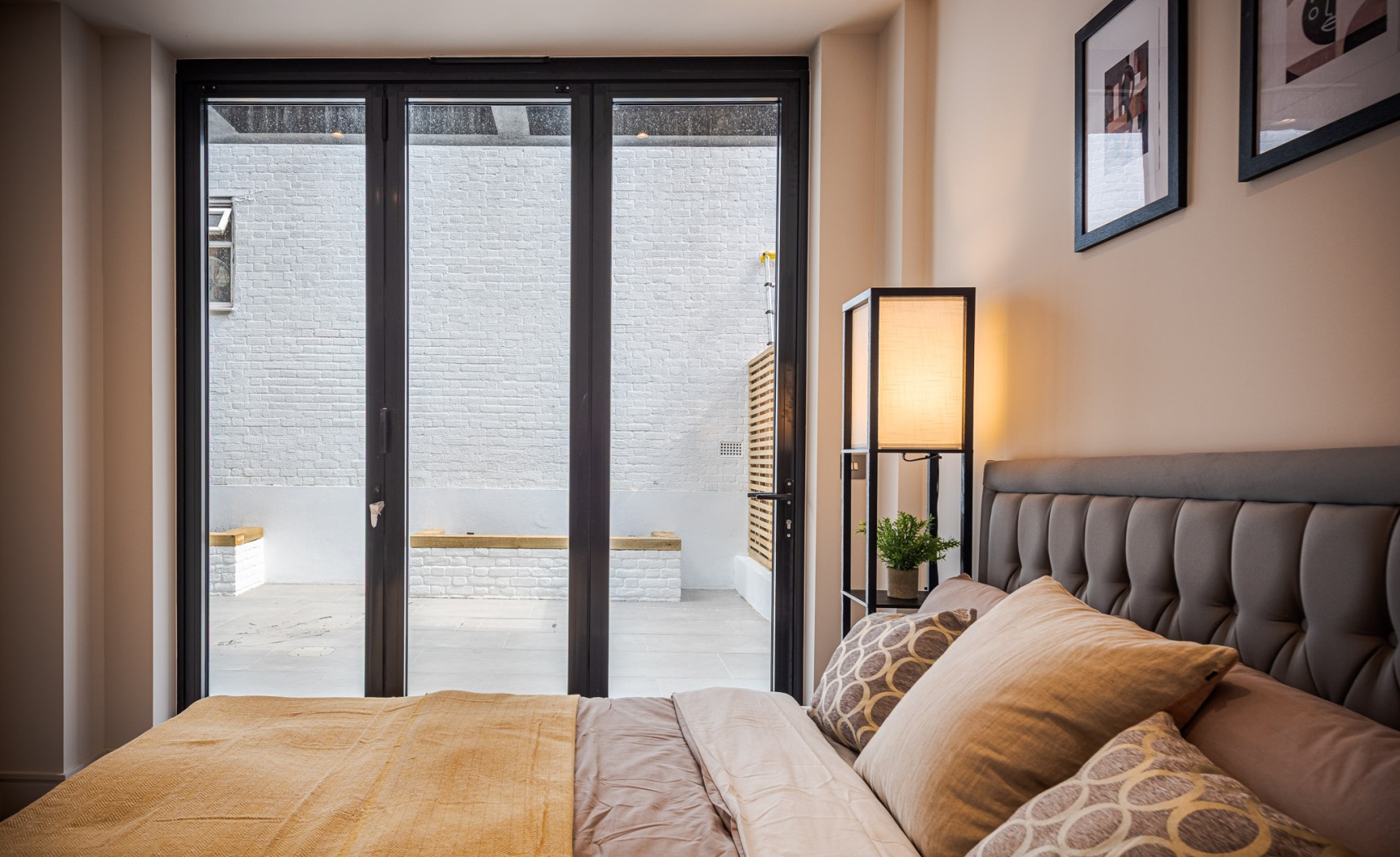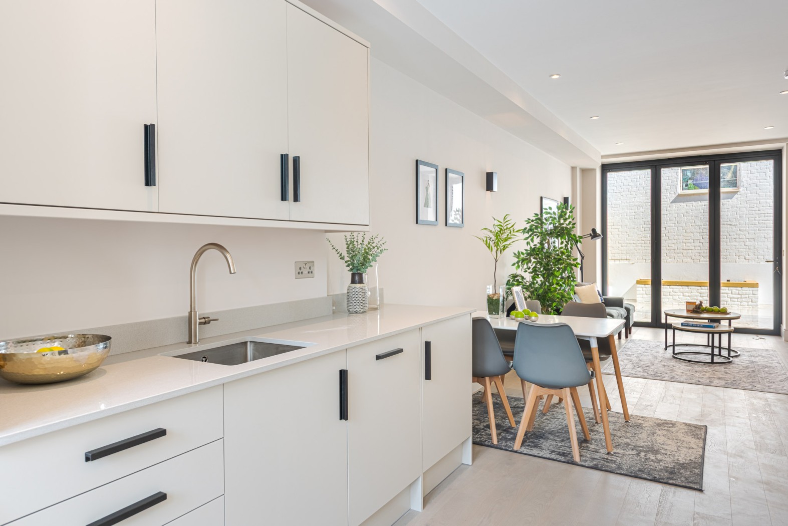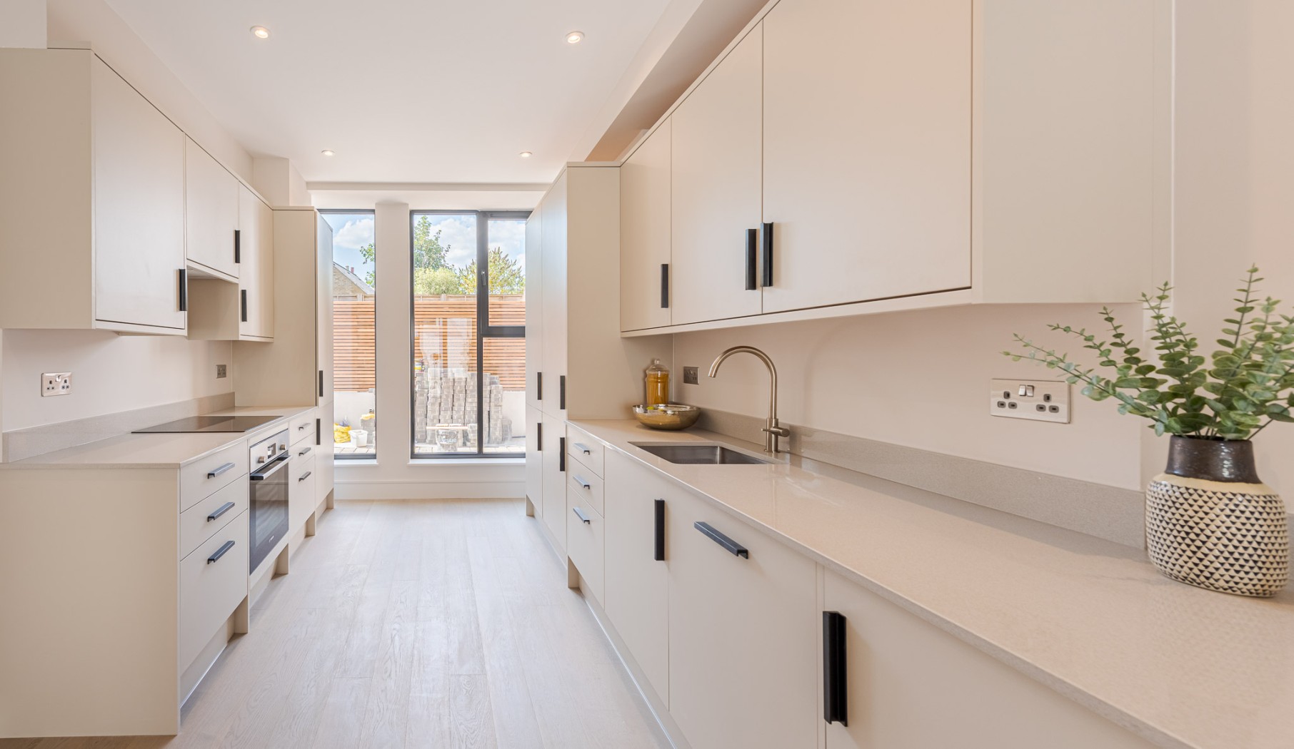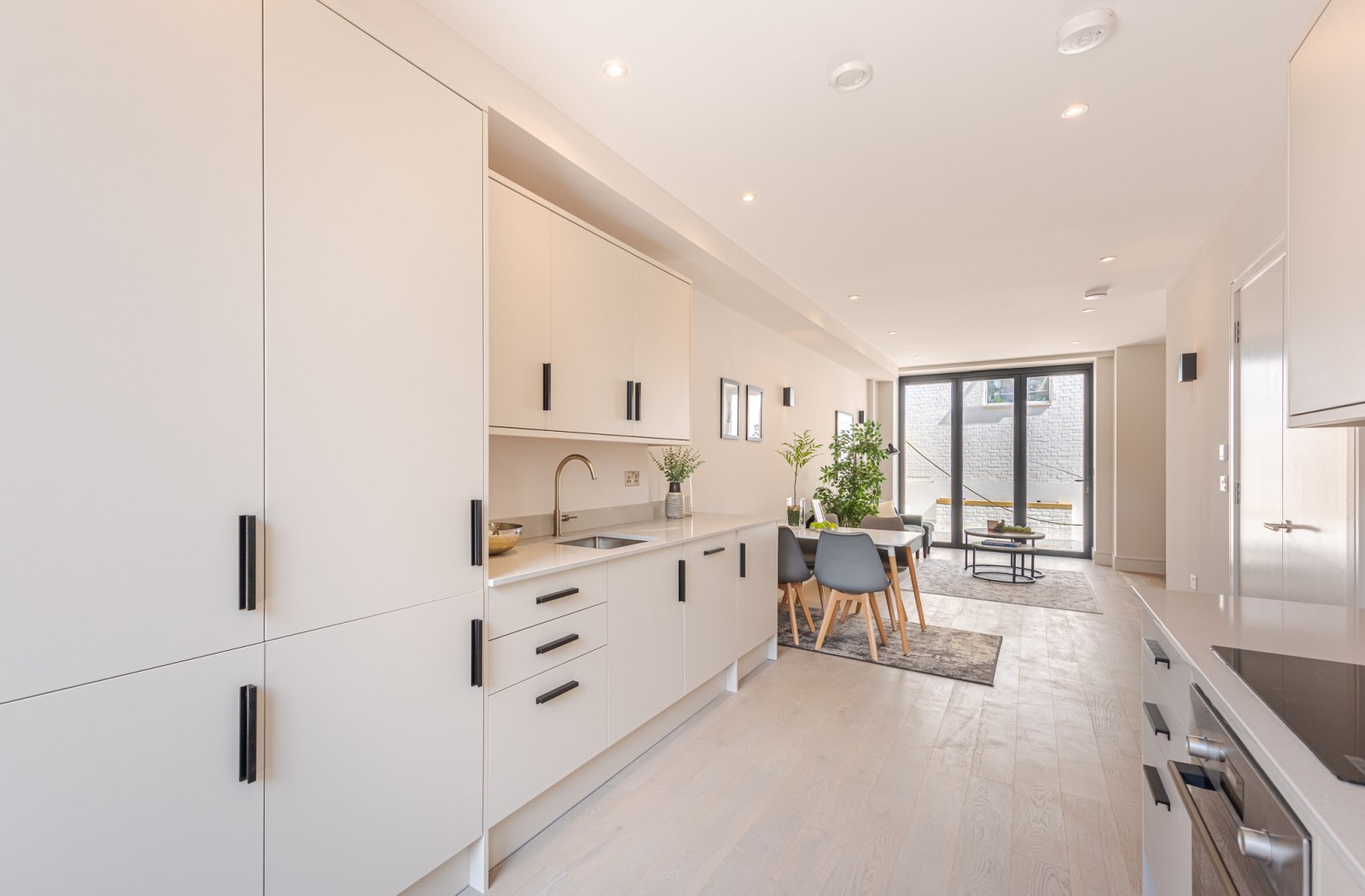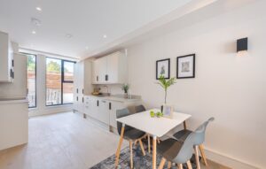 Located on the ground-floor corner of the striking St John’s Hall, this newly constructed 748 SqFt lateral apartment seamlessly blends contemporary luxury with historic charm. As you pass through the secure private entrance, you’re greeted by a generous hallway opening through stylish double doors onto the expansive open-plan kitchen and reception area-stretching over 10 metres and serving as the true heart of the home. At the front, the bespoke kitchen boasts sleek cabinetry, integrated appliances and quartz worktops, providing an stylish space for cooking and dining. At the rear, the reception area is bathed in natural light from sliding doors, which lead directly to your own private garden-a rare and substantial outdoor retreat in central Streatham, ideal for al fresco entertaining or relaxation.