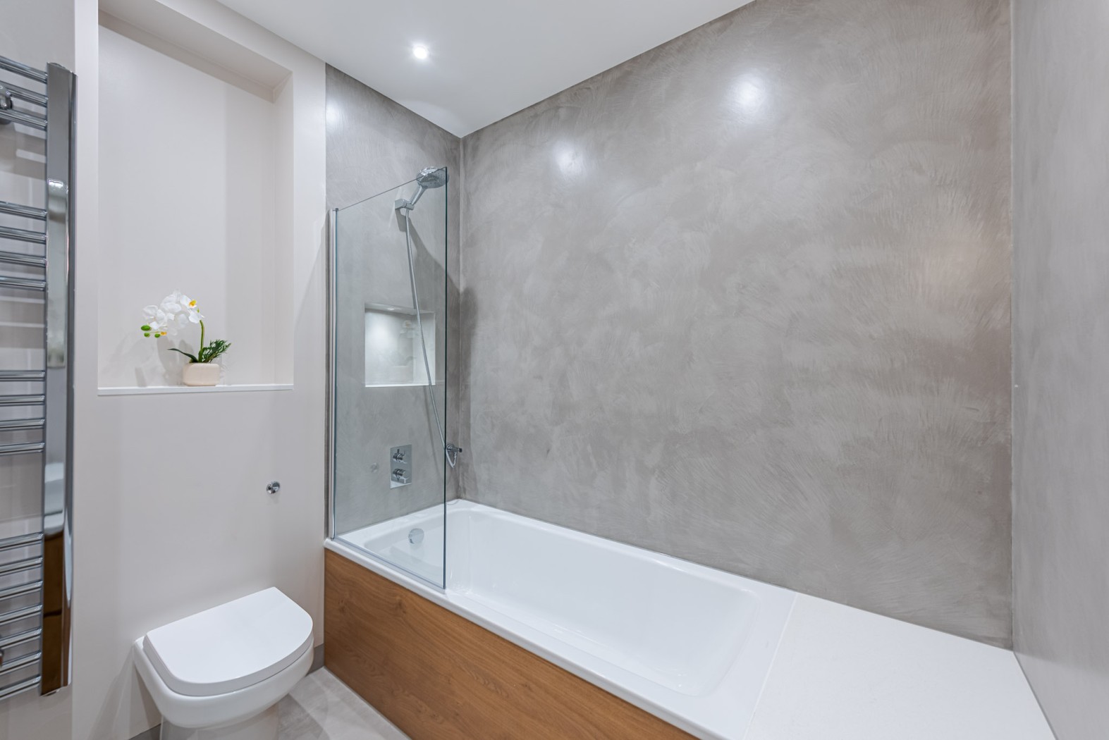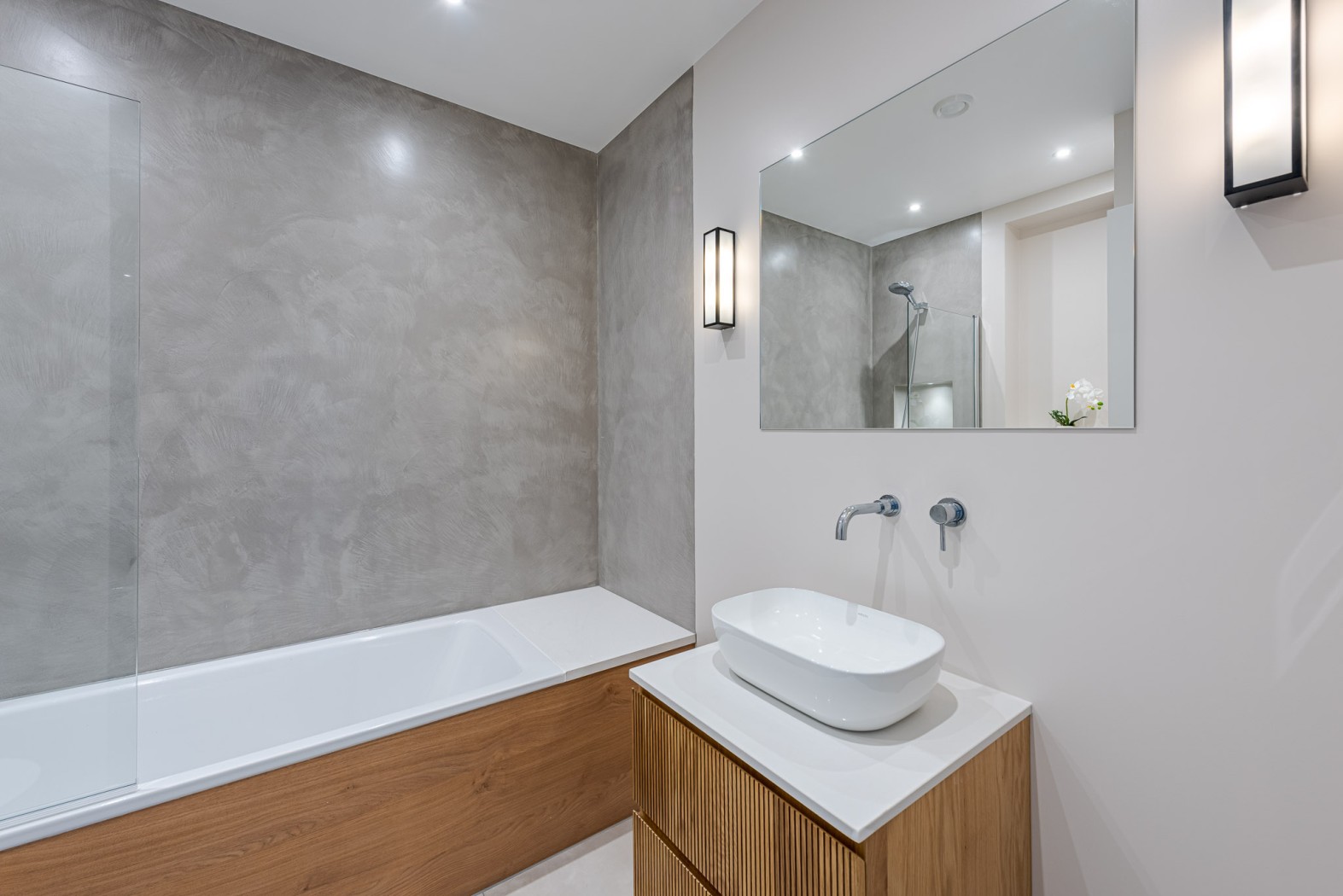 Two well-proportioned double bedrooms, positioned at either end of the apartment, benefit from large, light-filled windows and offer both privacy and comfort. A beautifully appointed family bathroom, finished with premium fixtures and a contemporary concrete-style palette, completes this exceptional home.