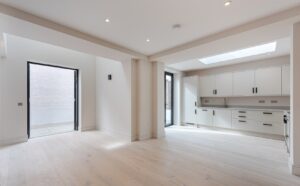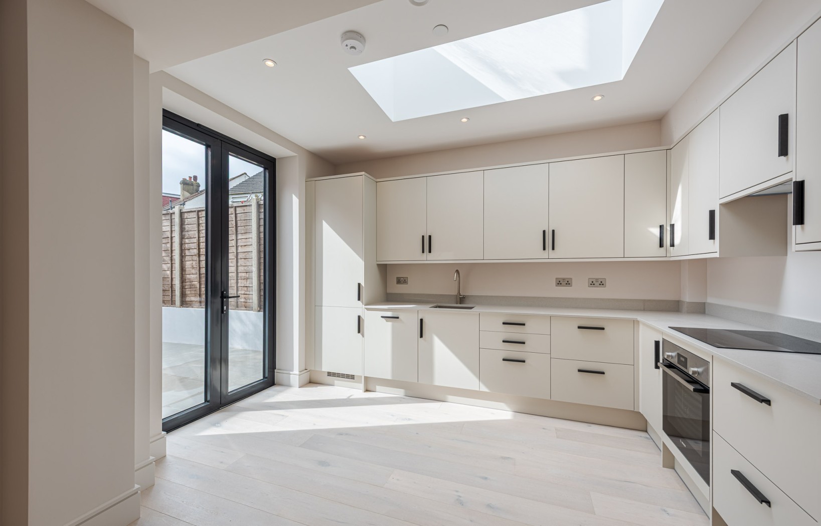 Located on the ground-floor corner of the striking St John’s Hall, this newly constructed 850 sq ft lateral apartment offers a seamless blend of contemporary luxury and historic character. Entering through a secure private entrance, you're welcomed by two generously sized double bedrooms, with the expansive open-plan kitchen and reception room positioned at the rear-overlooking the first of two private gardens and serving as the true heart of the home. On one side, the bespoke kitchen features sleek cabinetry, integrated appliances and elegant quartz worktops, creating a stylish and functional space for cooking and dining. On the other, the bright and spacious reception area is flooded with natural light from large double doors that open onto a substantial private garden-an exceptionally rare find in central Streatham, perfect for entertaining or unwinding outdoors.