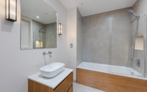 Two well-proportioned double bedrooms, positioned at either end of the apartment, benefit from large, light-filled windows and offer both privacy and comfort. A beautifully appointed family bathroom and en-suite bathroom are both finished with premium fixtures and a contemporary concrete-style palette, completes this exceptional home.
