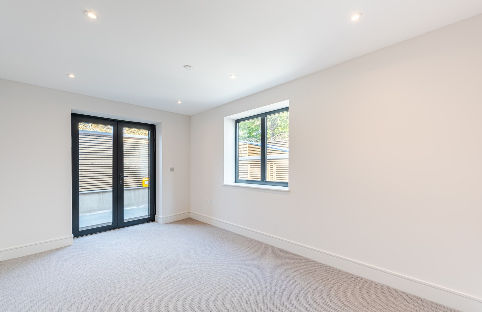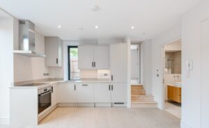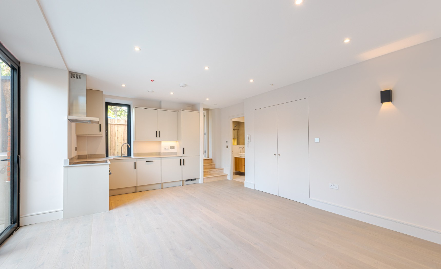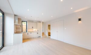 Located on the ground-floor corner of the striking St John’s Hall, this newly constructed 760 SqFt lateral apartment seamlessly blends contemporary luxury with historic charm. As you pass through the secure private entrance, you’re greeted by a generous and expansive open-plan kitchen and reception area serving as the true heart of the home. At one side, the bespoke kitchen boasts sleek cabinetry, integrated appliances and quartz worktops, providing an stylish space for cooking and dining. The reception area is bathed in natural light from sliding doors, which lead directly to your own private courtyard, ideal for al fresco entertaining or relaxation.