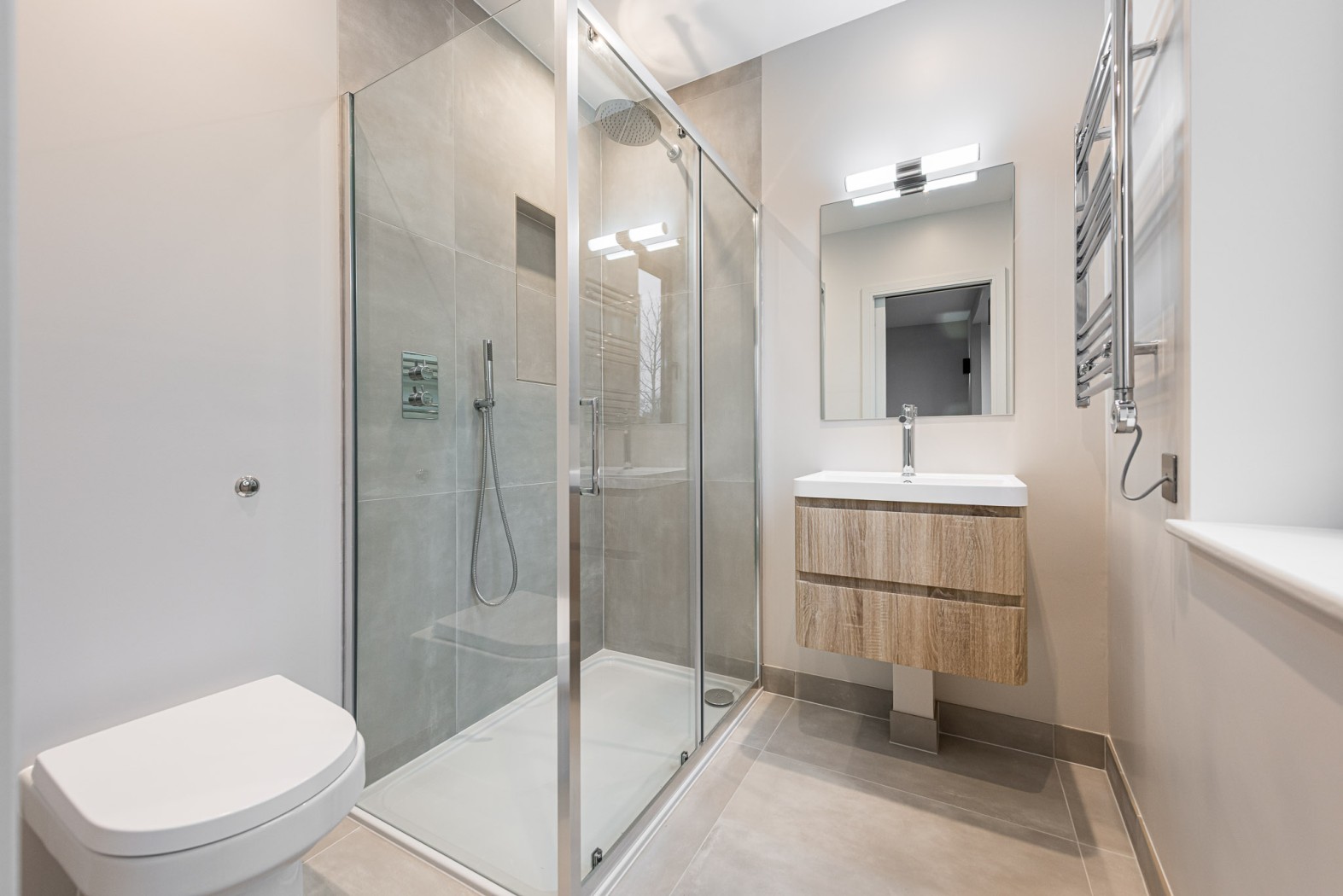 The first floor accommodates a generous principal bedroom at the front of the house, filled with natural light from a large bay window and offering ample space for storage. This room further benefits from a contemporary en-suite shower room finished with striking tiling. Two further well-proportioned double bedrooms are located to the rear, alongside a modern family bathroom featuring both a bath and a separate shower.