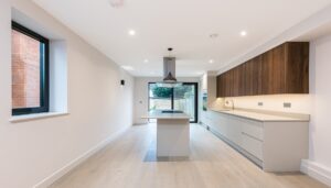 Upon entering, you are welcomed into an expansive double reception room with engineered oak flooring and excellent proportions, providing a versatile space for both entertaining and everyday relaxation. To the rear lies a bright and beautifully appointed kitchen and dining room, perfectly designed for modern living. This superb space benefits from engineered wood flooring and large bi-fold doors that flood the room with natural light and open directly onto the garden. The kitchen is fitted with extensive wall and base units, integrated Bosch appliances including fridge/freezer, dishwasher, oven and microwave, sleek quartz worktops, and a substantial central island that also serves as a breakfast bar.