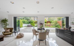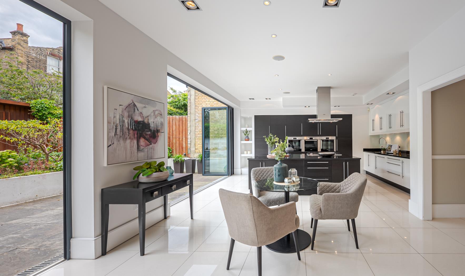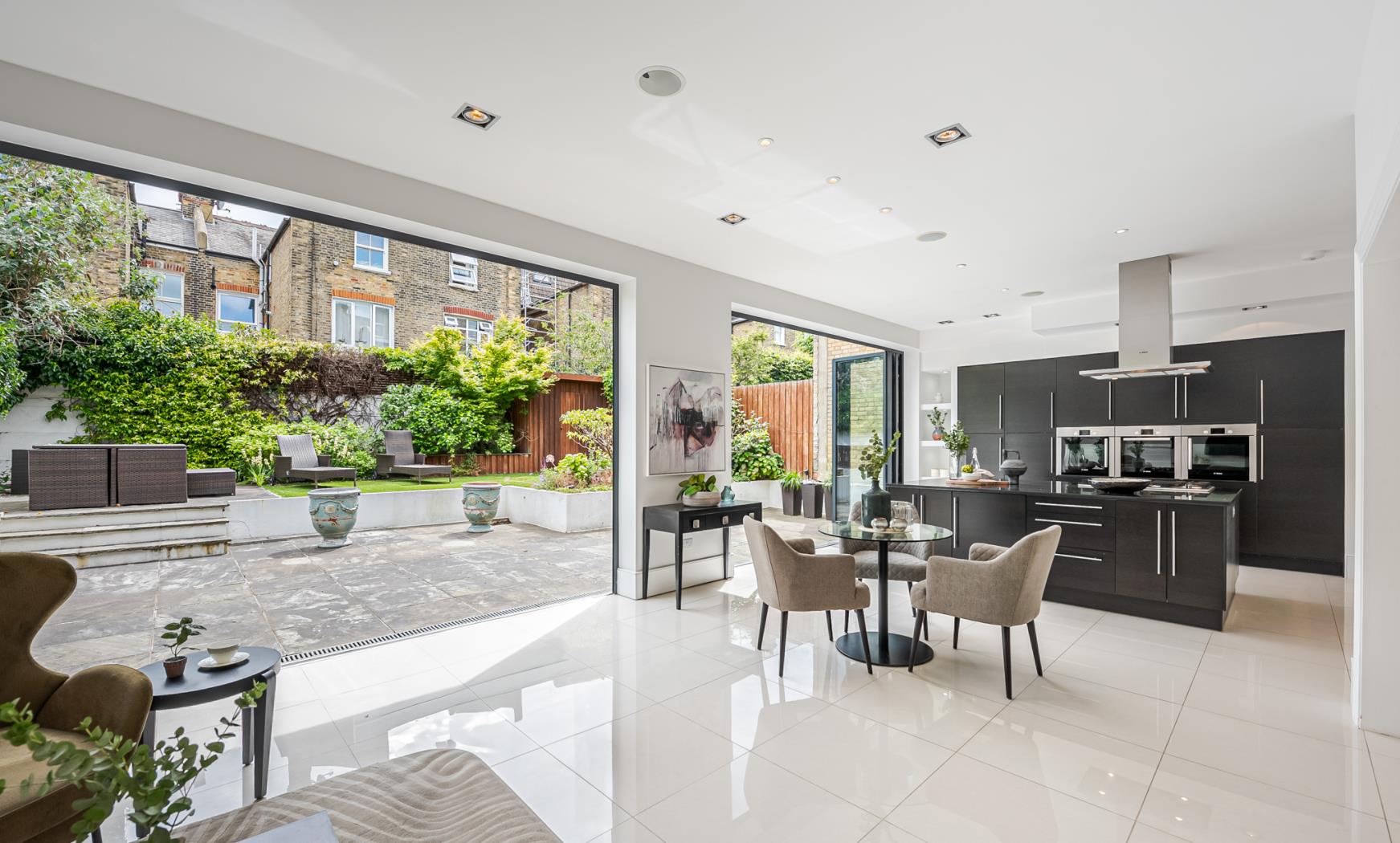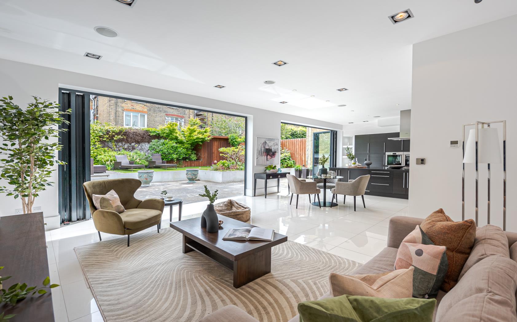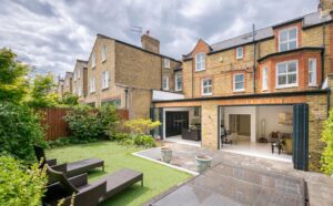 Beyond these front rooms, you are greeted by a stunning open-plan kitchen/reception that has been fully extended to provide an impressive and incredibly light space perfect for entertaining. The kitchen boasts a large island with marble work surfaces, bespoke cabinetry, and integrated Miele appliances. Two sets of large bi-folding doors open to a beautifully landscaped patio garden and lawn at the rear, measuring over 36 feet in width, which is incredibly rare for the area. Additionally, there is a wine cellar and a study area on the lower ground floor, which could be extended subject to the usual consents.