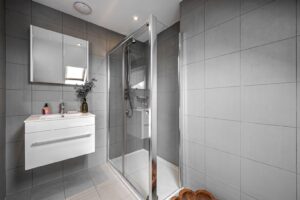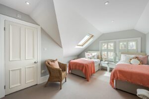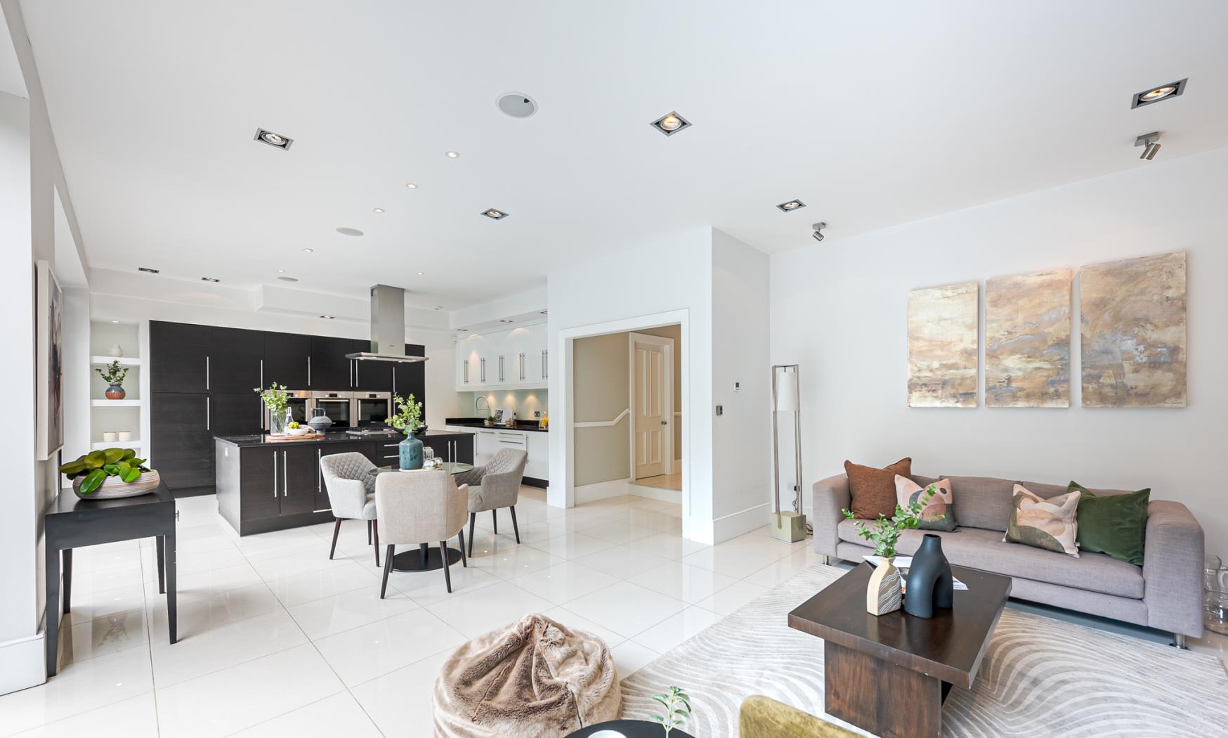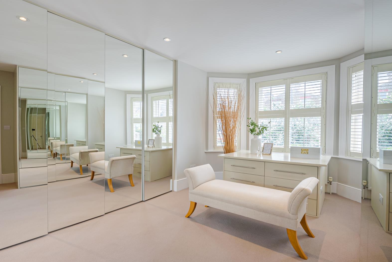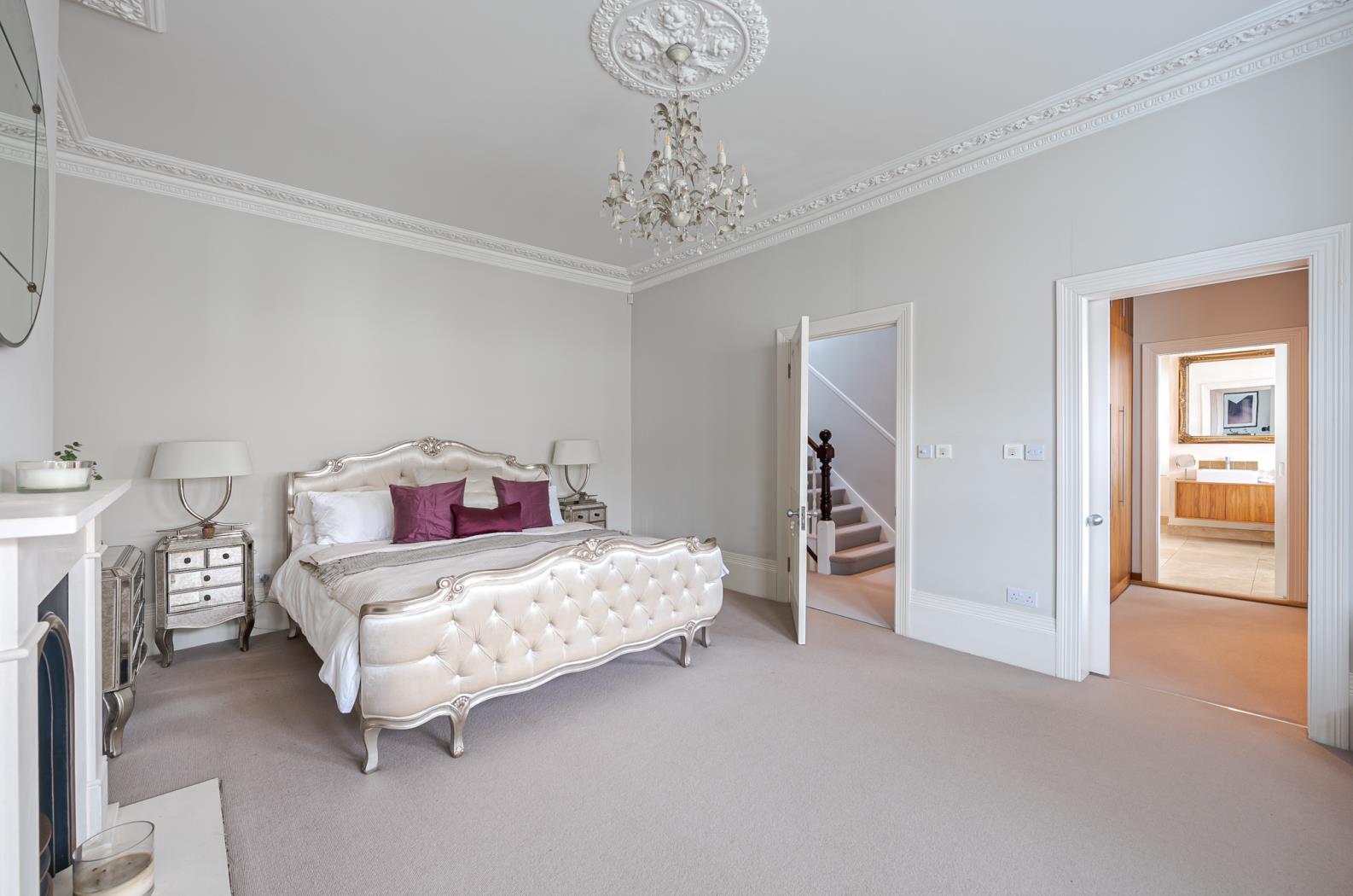 The principal bedroom is situated on the first floor, occupying the entire front of the house. It features a walk-in wardrobe leading to an expansive and luxurious en-suite bathroom with twin sinks, a walk-in shower, and a freestanding feature bath. Two more double bedrooms, one with an en-suite, are also on the first floor. The top floor comprises a family bathroom and four double bedrooms, with the largest bedroom featuring a smart en-suite shower room.