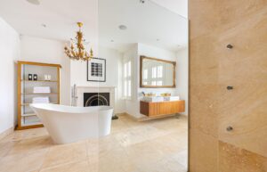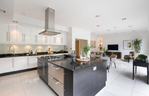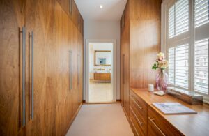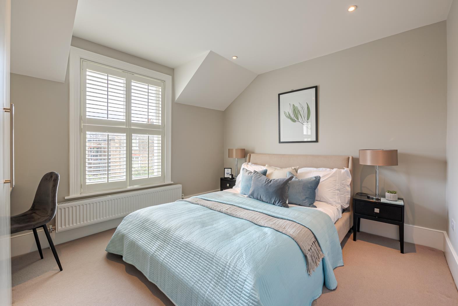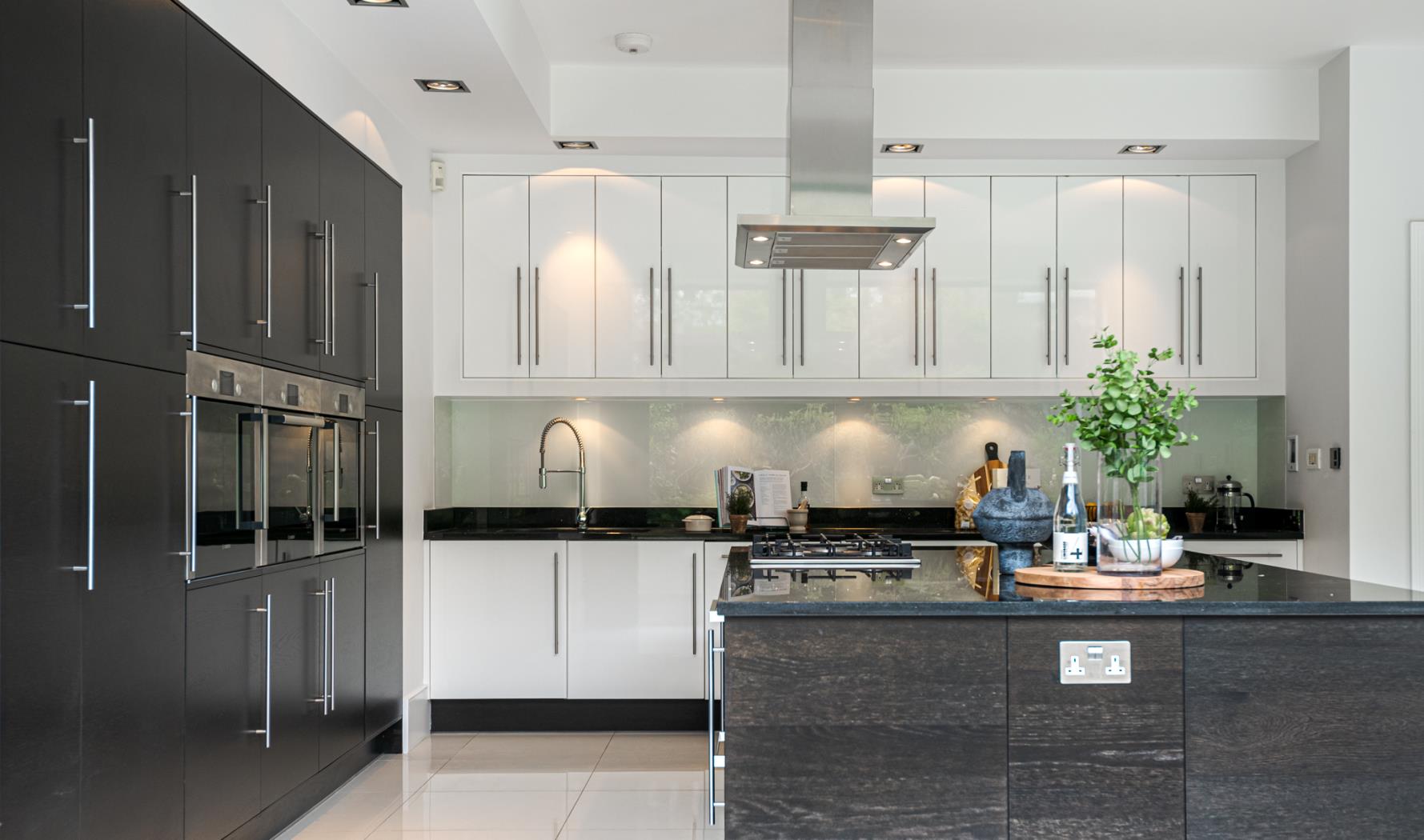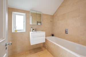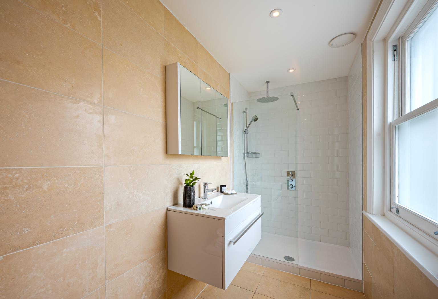 The principal bedroom is situated on the first floor, occupying the entire front of the house. It features a walk-in wardrobe leading to an expansive and luxurious en-suite bathroom with twin sinks, a walk-in shower, and a freestanding feature bath. Two more double bedrooms, one with an en-suite, are also on the first floor. The top floor comprises a family bathroom and four double bedrooms, with the largest bedroom featuring a smart en-suite shower room.