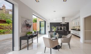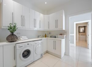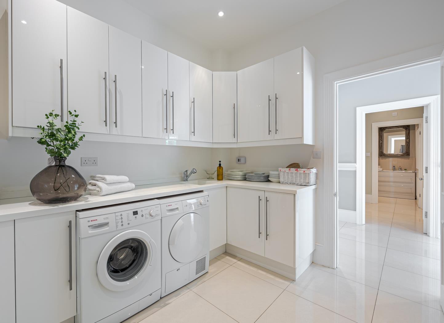At the front of the house, you'll find an elegant drawing room on one side and a generous dining room on the other. Both rooms benefit from wonderful ceiling height, which floods the space with natural light. They also feature bay windows, detailed ceiling cornicing, and elegant fireplaces. Adjacent to the dining room is a utility room with a separate entrance on the right side of the house.